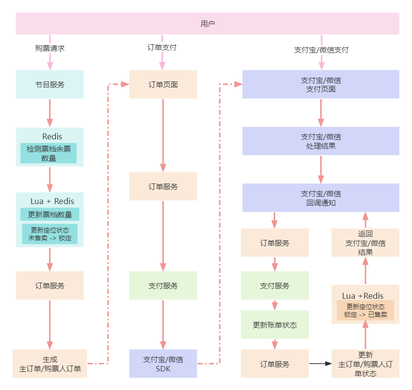 为了让小伙伴对整个流程更加的清晰,本人画了张总体流程图来概括从购票到最后购买完整的执行过程 并使用不同颜色来分别代表不同的服务执行